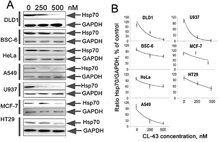 Figure 6: CL-43 effectively reduces Hsp70 expression in tumor cells of different origination. (A) The cells of lines listed in the figure were treated with CL-43 at concentrations of 250 and 500 nM for 18 h and Western blotting was performed. (B) The intensity of bands from (A) presented as the ratio between band intensity of Hsp70 and band intensity of GAPDH used for loading control. Band intensity was estimated with use of TotalLab software summarizing the results of two independent experiments.
