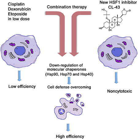 Figure 7: Principle of HSF1 inhibitor action in cancer cells. Tumors are generally resistant to anti-cancer drugs (left panel). Since this resistance is based on HSF1 transcription factor and a few of heat shock proteins Hsp90, Hsp70, Hsp40, the combinational therapy should include compound suppressing HSF1 activity and the traditional anti-tumor medicines like etoposide or cisplatin (central panel). Newly identified compound CL-43 is safe substance that was found to elevated activity of etoposide, cisplatin and doxorubicin in cancer cells of distinct origin (right panel).