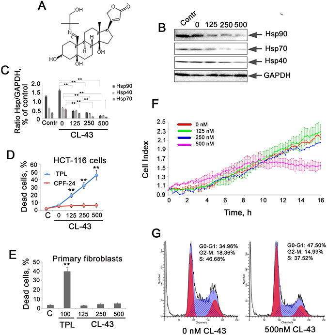 Figure 2: CL-43 inhibits the expression of three chaperones controlled by HSF1 and inhibits proliferation of HCT-116 cells. (A) Formula of cardenolide CL-43. (B) Western blotting analysis of HCT-116 cells treated with CL-43 at concentrations of 125, 250, and 500 nM for 18 h. Point “0 nM” means cells treated with vehicle (DMSO) alone. Contr – untreated HCT-116 cells. (C) The intensity of bands from (B) presented as a ratio between the given chaperone and the band intensity of GAPDH used for loading control. Band intensity was estimated with use of TotalLab software summarizing the results of three independent experiments. HCT-116 (D) cells or primary fibroblasts (E) were seeded to wells of 96-well plates and then were treated with CL-43 or TPL in concentration indicated for 20 hours. The level of cell death was LDH activity in cell medium. **p < 0,01. (F) HCT-116 cells were seeded to wells of E-plates and when they attached to the bottom, CL-43 was added in concentrations of 125, 250, and 500 nM. Recording with aid of xCELLigence equipment was started immediately after CL-43 administration and lasted 20 h. Data from five independent experiments are presented. (G) HCT-116 cells were treated with 500 nM CL-43 or with vehicle (DMSO) in the same volume (0 nM). After 18 h, cell cycle was measured using the flow cytometry technique.