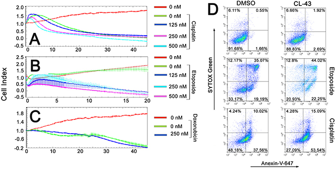 Figure 4: The anti-cancer effects of combining CL-43 and traditional anti-cancer drugs. (A–C) HCT-116 cells previously incubated with CL-43 in various concentrations for 18 h were seeded to wells of E-plates. When the cells attached to the well bottom, anti-cancer drugs were added: (A) cisplatin, (B) etoposide and (C) doxorubicin. Recording was started immediately after drug administration and lasted 45 h (except the experiment with etoposide which lasted only 20 h). (D) HCT-116 cells were incubated first with CL-43 at a concentration of 250 nM, prior to etoposide (200 μM) or cisplatin (50 μM) treatment. Apoptosis was evaluated by staining cells with Annexin-V combined with SYTOX Green dye.