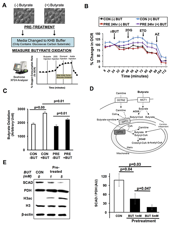 In recent years, our lab has sought to identify factors or conditions that impact the oxidation of butyrate in colorectal cancer cells. Since butyrate modulates gene expression through inhibiting histone deacetylases, we postulated that butyrate could directly affect its own metabolic fate through changing the expression of proteins that oxidize short chain fatty acids. To begin to test this possibility, HCT116 colorectal cancer cells were pretreated with or without butyrate, and butyrate oxidation was measured as the percent change in the oxygen consumption rate (Figure 1A). In the assay, cells are maintained in a Fatty Acid Oxidation Media containing KHB buffer and only 2.5 mM glucose as the only exogenous carbon substrate. During the assay butyrate, 2-deoxyglucose (2DG), etomoxir, and sodium azide are injected into the media. The 2DG blocks glucose utilization, thus leaving butyrate as the sole exogenous energetic substrate. Etomoxir, inhibits carnitine palmitoyltransferase and the contribution of endogenous lipids to oxidative metabolism. Butyrate oxidation represents the total area under the curve following the addition of 2DG to the time when sodium azide is injected. In pretreated cells, butyrate repressed its own oxidation when compared to non-pretreated cells (Figure 1B). After 2DG injection, butyrate oxidation was significantly lower in pretreated cells as compared to non-pretreated control cells (Figure 1C). RKO cells were used to confirm whether butyrate pretreatment would decrease butyrate oxidation in an additional colorectal cancer line. Indeed, pretreatment with butyrate in RKO cells significantly diminished butyrate oxidation as compared to cells not pretreated with butyrate (Supplementary Figure 1). This suggested that the ability of butyrate to suppress its own oxidation is not limited to a single colorectal cancer cell line.