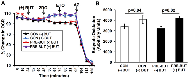 Non-cancerous colonocytes efficiently oxidize butyrate, and it is unclear whether pretreatment with butyrate would affect this process. In addressing this issue, colonocytes where isolated from adult mice, and pretreated with and without butyrate. Butyrate oxidation was measured as before in colonocytes after pretreatment. Butyrate increased the oxygen consumption rate to the same level after 2DG addition in both experimental conditions, non-pretreated and pretreated (Figure 2A). As opposed to colorectal cancer cells, pretreatment with butyrate did not show decreased oxidation when compared to non-pretreated colonocytes (Figure 2B). Thus, the ability of butyrate to decrease its own oxidation appears to be selective to colorectal cancer cells. Although, these future studies are needed to confirm this is the case in primary human colonocytes.