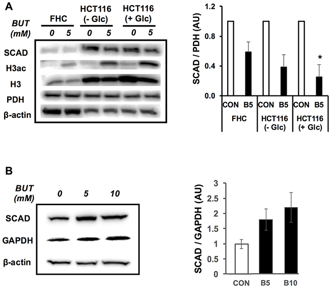 Figure 3: Butyrate decreases SCAD expression in cancerous but not primary colonocytes. (A) Western blot showing SCAD expression in FHC cells and HCT116 cells that were treated with (0 mM, CON) or without butyrate (5 mM, B5). HCT116 cells were grown under the absence (2.5 mM glucose) and presence (25 mM glucose) for the Warburg effect. Right panel shows quantification of SCAD levels relative to PDH levels. (B) Western blot showing SCAD levels in isolated normal colonocytes with butyrate (0 mM, CON; 5 mM, B5 and 10 mM. B10). Quantification of SCAD expression relative to GAPDH is shown in right panel. For statistical analysis, western blot was conducted 5 times per condition. Error bars are Mean ± SEM. *p<0.05 indicates significant difference between cells treated with butyrate vs. controls.