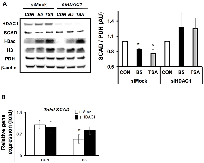 In colorectal cancer, HDAC 1, HDAC 2, and HDAC 3 are highly expressed in order to accelerate cell proliferation, growth and survival [42, 43]. Butyrate effectively inhibits most HDACs, which results in decreased cell proliferation and induction of cell apoptosis in the cancer cells [15, 18]. Since butyrate along with other HDAC inhibitors decreased SCAD levels, it was unclear whether a selective HDAC was responsible for the effect. Therefore, HDAC1, HDAC2, or HDAC3 were knocked down using RNAi and these cells were treated with butyrate to test whether SCAD reduction is augmented by a selective HDAC knockdown condition. While butyrate and TSA significantly decreased SCAD levels in siMock cells, siHDAC1 transfected cells did not show decreased SCAD levels after butyrate treatment (Figure 6A). Scad mRNA levels were also measured to confirm that knockdown of HDAC1 inhibited butyrate’s ability to reduce Scad gene expression. Butyrate was no longer able to decrease Scad mRNA levels when HDAC1 was knocked down (Figure 6B). RNAi knockdown of HDAC2 and HDAC3 in HCT116 cells did not impact SCAD levels like as HDAC1 (Supplementary Figure 4). These findings demonstrate that butyrate targets HDAC1 to decrease SCAD levels in the colorectal cancer cells. These data also suggest that although butyrate is a general HDAC inhibitor, its effects can be mediated through a specific HDAC.