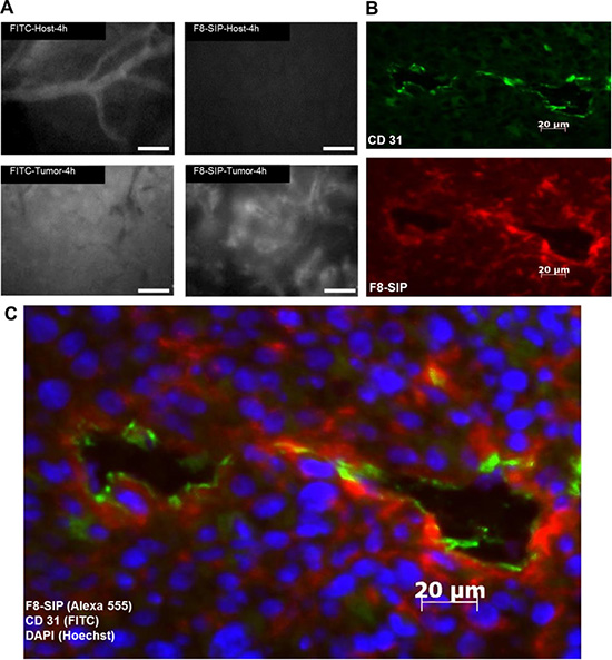 Figure 1: Bio-distribution of F8-SIP-Alexa555 in SF126 skin chamber tumors. (A) Mice with skin chambers received 30000 SF126 cells 2 days after surgery or control injection (5 animals per group). After tumor growth of further 7 days, F8-SIP-Alexa-555 antibody and FITC was injected. Representative demonstration of vascular accumulation of F8-SIP around tumor vessels using intravital fluorescence video microscopy (IFVM). No antibody accumulation could be detected around host tissue blood vessels 4 h after injection. Application of FITC demonstrated very leaky tumor blood vessels in comparison to host vessels. Scale bar represents 20 μm. (B) Animals were sacrificed after 24 h and tissue was further processed for immunohistochemistry (for details see methods section). Endothelial cell staining with CD31 (green) and F8-SIP-Alexa-555 (red) co-localized to the tumor endothelium (ab-luminal accumulation) and extravasation of the antibody into the interstitial space of the tumor is shown. (C) Merged CD31 (green) and F8-SIP (red) of B) with DAPI staining (blue) showing tumor and host cell nuclei in higher magnification. Scale bar represents 20 μm.