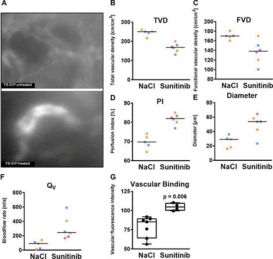 Figure 3: F8-SIP demonstrates improved vascular accumulation in sunitinib resistant tumor vessels. (A) Mice with skin chambers received 20000 SF126 cells 2 days after surgery or control injection. After tumor growth of further 7 days, treatment groups were randomized for sunitinib treatment (40 mg/kg BW on 6 consecutive days; 4 animals) or control injections with NaCl (2 animals). Representative intravital microscopy images demonstrating an enhanced binding of F8-SIP to tumor vessels after sunitinib treatment compared to untreated tumor vessels (NaCl) after 24 h. (B) Total vascular density (TVD) was lower in sunitinib treated tumors compared to untreated tumors. Data points represent n = 2 animals each with 2 and 3 tumor fields, respectively, coded by colors in the NaCl-group and n = 4 animals with 1 or 2 tumor fields coded by colors in the sunitinib group. Lines indicate the median per group. This data set is a conformation of previously published data and limited due to the availability of antibody [8, 12, 13, 15, 19]. No statistical test was performed. (C) Functional vascular density (FVD) was lower after sunitinib therapy. Data points represent n = 2 animals each with 2 and 3 tumor fields, respectively, coded by colors in the NaCl-group and n = 4 animals with 1 or 2 tumor fields coded by colors in the sunitinib group. Lines indicate the median per group. (D) Perfusion index (PI) was higher in sunitinib treated vessel compared to no treatment due to the lower TVD and FVD after sunitinib treatment. Data points represent n = 2 animals with 2 and 3 tumor fields, respectively, coded by colors in the NaCl-group and n = 4 animals with 1 or 2 tumor fields coded by colors in the sunitinib group. Lines indicate the median per group. (E) Mean vascular diameter per region of interest was significantly larger with antiangiogenic therapy. Data points represent n = 2 animals each with 2 and 3 tumor fields, respectively, coded by colors in the NaCl-group and n = 4 animals with 1 or 2 tumor fields coded by colors in the sunitinib group. Lines indicate the median per group. (F) Analysis of microvascular blood flow shows higher blood flow in antiangiogenic therapy resistant blood vessels. Data points represent n = 2 animals with 2 and 3 tumor fields, respectively, coded by colors in the NaCl-group and n = 4 animals with 1 or 2 tumor fields coded by colors in the sunitinib group. Lines indicate the median per group. (G) Vascular fluorescence analysis of NaCl treated animals (circles indicate 7 days of tumor growth (n = 5) and triangle indicates 14 days of tumor growth, n = 2) and Sun (n = 4) treated animals revealed a significantly higher fluorescence signal in sunitinib group. Data points represent averaged values over 5-6 tumor fields per animal, Mann-Whitney U test, p = 0.006.