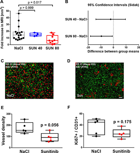 Figure 4: Sunitinib treatment successfully reduces angiogenesis and tumor growth in orthotopic glioma while inducing vascular resistance. (A) MRI imaging on day 4 and day 9 after lateral inoculation of 20000 SF126 cells resulted in an 14.5 [9.5; 19.0] median and 25th and 75th percentile of IQR fold or 68.3 mm3 increase in tumor volume that was reduced to 14.6 [12.8; 17.4] fold or 60.1 mm3 (40 mg/ kg BW sunitinib on 5 consecutive days) and 6.3 [2.2; 13.8] median and 25th and 75th percentile of IQR or 30.7 mm3 if treated twice with 80 mg/ kg BW on day 4 and 7. Kruskal-Wallis ANOVA with Dunn’s multiple comparison method. (B) Plots of the difference between group means of fold decreases of tumor volumes and 95% confidence intervals versus NaCl treated tumors. Only mice treated with 80 mg/ kg BW on day 4 and 7 showed a reduction of approximately 49% of tumor volume on average. One way ANOVA followed by Dunn’s posthoc measurements, p = 0.017. (C and D) Representative images of immunohistochemical analysis of placebo (NaCl) and sunitinib therapy SF126 intracranial gliomas. Tumor vessel proliferation was detected using CD31 endothelial marker (red) and Ki67 proliferation marker (green). Bar indicates 20 μm. (E) Quantified results of immunohistochemical analysis for total vascular density by CD31 staining demonstrating lower vascular density in sunitinib compared to NaCl treated tumors; Data points represent averaged values over 5-6 tumor fields per animal, n = 5 animals per group, Mann-Whitney U test, p = 0.056. (F) Graphical illustration of quantified results of immunohistochemical analysis for endothelial cell proliferation. Double staining of blood vessels (CD31) and proliferative cells (Ki67) revealed a lower but not statistically significant median count of proliferative tumor endothelial cells with sunitinib treatment compared to placebo (NaCl). Data points represent averaged values over 5-6 tumor fields per animal, n = 5 animals per group, Mann-Whitney U test, p = 0.175.