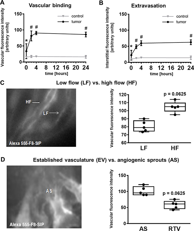 Figure 2: F8-SIP antibody binds to high flow tumor vasculature and angiogenic sprouts. (A) Intravital microscopy after 7 days of tumor inoculation confirms F8-SIP antibody binding to tumor vasculature as early as 2 h post i.v. injection and stable binding profile until 24 h past the experiment. Data represents mean ± 95% confidence interval, n = 5 animals per group, two way repeated measures (RM) ANOVA with Sidak’s posthoc test and F (3, 24) = 31.35, p < 0.001 for interaction of tumor and time after injection (tumor accounts for 71.3% of variance, time for 12.4% of variance and interaction of tumor and time for 11% of the variance). Asterisk (#) marks p < 0.0001 versus control, pound (*) marks p < 0.0072 versus control. (B) Similar to the vascular binding, the F8-SIP antibody extravasates 2 h post i.v. injection and remains bound until the end of the experiment. Data represents mean ± 95% confidence interval, n = 5 animals per group, two way RM ANOVA with Sidak’s posthoc test and F (3, 24) = 34.77 and p < 0.0001 for interaction of tumor and time after injection; asterisk (#) marks p < 0.0001 versus control, pound (*) marks p < 0.05 versus control (tumor accounts for 66.9% of variance, time for 16.5% of variance and interaction of tumor and time for 10.7% of the variance). (C) Comparison of low flow (blood flow rate < 20 nl/s) and high flow (blood flow rate > 60 nl/s) tumor vessels revealed a higher F8-SIP binding to high flow tumor vessels (p = 0.0625). Data points represent the average of analyzed vessels per animal, n = 5 animals, paired Wilcoxon test with 5 pairs. Further analysis of the F8-SIP antibody binding affinity revealed a higher binding in angiogenic sprouts (AS) compared to the established tumor vasculature (EV). Data points represent the average of analyzed vessels per animal, n = 5 animals, paired Wilcoxon test with 5 pairs (p = 0.0625). (D) Boxplots represent median as well as lower and upper limit of the interquartile range (25th and 75th percentile), with whiskers giving the minimum and maximum values.