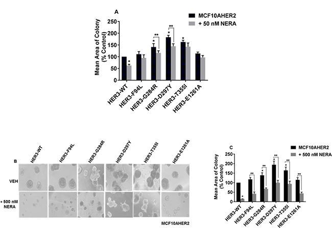 Figure 7: Sensitivity of MCF10AHER2 cells expressing HER3 mutations to neratinib. (A) MCF10AHER2 cells expressing HER3WT and HER3 mutants (F94L, G284R, D297Y, T355I and E1261A) were seeded on a basement membrane of 3D matrigel ± 50 nM neratinib. The average size of each cellular structure was quantified. The value is represented as mean of areas ± SEM, (n = 3, from three independent experiments. *P < 0.01 versus WT without neratinb treatment, **P < 0.05 versus respective HER3 mutants (G284R and D297Y) without neratinb treatment. (B–C) MCF10AHER2 cells expressing HER3WT and HER3 mutants(F94L, G284R, D297Y, T355I and E1261A) were seeded on a basement membrane of matrigel and treated with 500 nM neratinib every second day. Phase contrast images of acini were captured at 10x magnification and the average size of each cellular structure was quantified and expressed as mean of areas ± SEM, (n = 3 independent experiments performed in triplicate). *P < 0.05 versus WT without neratinib treatment and **P < 0.01 versus respective HER3 mutants (F94L, G284R, D297Y, T355I and E1261A) without neratinib treatment.