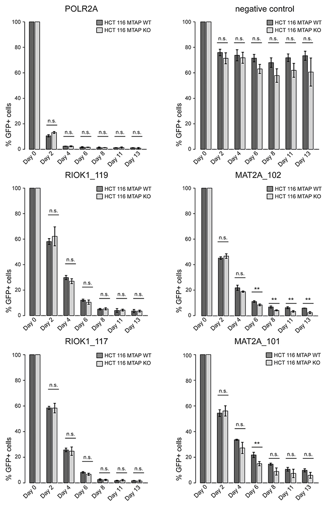 Figure 4: CRISPR based depletion assays reveal no differential requirement between MAT2A and RIOK1 in MTAP isogenic cell lines. CRISPR based depletion time course experiments in HCT 116 MTAP isogenic cell lines. Each gRNA was tested in three independent biological replicates and mean and standard deviation (error bars) are plotted (n.s. indicates non-significant; ** denotes p-values < 0.05; t-test). POLR2A serves as a core essential control gene. The ‘negative control’ refers to the same gRNA as used in Figure 2 (Neg.con._3). RIOK1_119, RIOK_117, MAT2A_102 and MAT2A_101 are representative gRNAs targeting RIOK1 and MAT2A respectively.