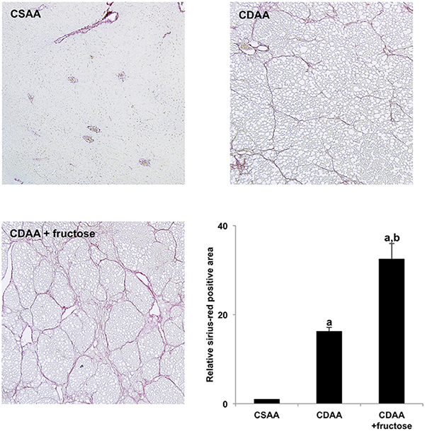 As shown in Figure 1, sirius-red staining of liver tissue showed no fibrosis in the CSAA group. In sharp contrast, marked fibrosis was observed in both CDAA-fed groups, with the CDAA + fructose group on semi-quantitative analysis having significantly more fibrosis than the CDAA group.