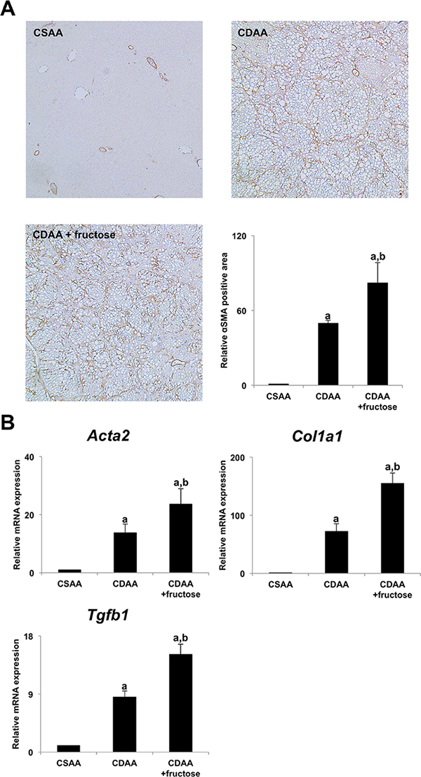 Figure 2: Fructose accelerated hepatic stellate cells-induced liver fibrogenesis. (A) No αSMA immunopositive cells are observed in the CSAA group. The area occupied by αSMA immunopositive cells is high in both CDAA-fed groups, with the largest area seen in the CDAA + fructose group. Original magnification x40. Semi-quantitative analysis confirms significant differences between the groups. (B) The expression of αSMA mRNA (Acta2) in the liver is significantly higher in both CDAA-fed groups when compared with the CSAA group, with the highest expression seen in the CDAA + fructose group. Findings for expression of transforming growth factor beta 1 (Tgfb1) and collagen-Iα (Col1a1) mRNA in the liver are similar. Data are presented as the mean ± standard deviation. aP < 0.05 compared with CSAA group; bP < 0.05 compared with CDAA group. CDAA, choline-deficient/L-amino acid; CSAA, choline-supplemented/L-amino acid; αSMA, alpha smooth muscle actin.