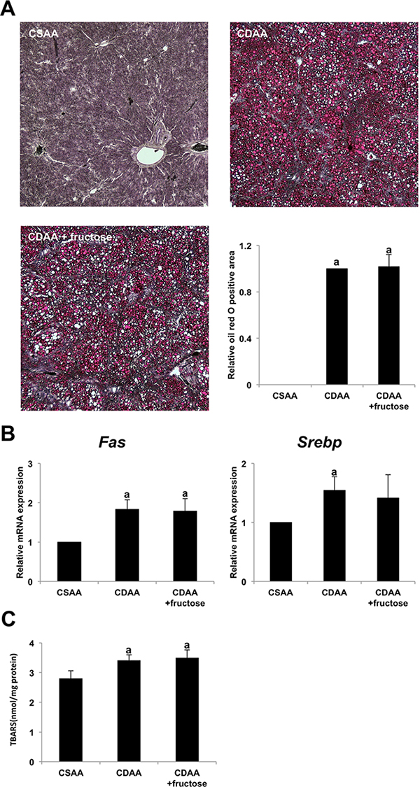 Figure 4: The effect of fructose administration on hepatic steatosis in the CDAA-induced steatohepatitis. (A) Fat droplet deposition indicated by oil red O staining. Original magnification x40. None is seen in the CSAA group, but it is conspicuous in both CDAA-fed groups Semi-quantitative analysis indicates no significant difference between the two CDAA-fed groups. (B) The expression of Fas mRNA and Srebp mRNA in the liver does not differ significantly between the two CDAA-fed groups. (C) Oxidative stress of liver tissue as evaluated by TBARS is significantly higher in the two CDAA-fed groups than the CSAA group. However, TBARS expression does not differ significantly between the two CDAA-fed groups. Data are presented as the mean ± standard deviation. aP < 0.05 compared with the CSAA group. CDAA, choline-deficient/L-amino acid; CSAA, choline-supplemented/L-amino acid; TBARS, thiobarbituric acid reactive substances.