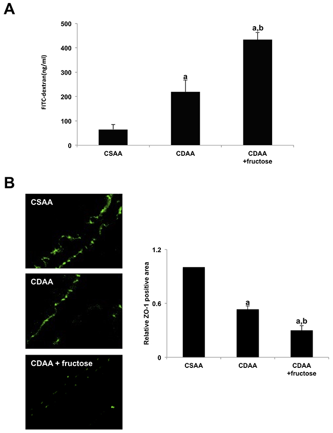 Figure 5: Fructose exacerbates intestinal permeability in rats. (A) The fluorescein level in the portal vein after FITC-dextran administration is significantly higher in both CDAA-fed groups compared with the CSAA group and is significantly higher in the CDAA + fructose group than the CDAA group. (B) Fructose attenuates TJPs in the small intestine. Immunohistochemical staining demonstrates adequate expression of ZO-1 in intestinal sections of the CSAA group compared with both CDAA-fed groups. Fructose further attenuates TJP expression as demonstrated by semi-quantitative analysis. Original magnification x400. Data are presented as the mean ± standard deviation. aP < 0.05 compared with the CSAA group; bP < 0.05 compared with the CDAA group. CDAA, choline-deficient/L-amino acid; CSAA, choline-supplemented/L-amino acid; FITC, fluorescein isothiocyanate; TJP, tight junction protein; ZO-1, zonula occludens-1.