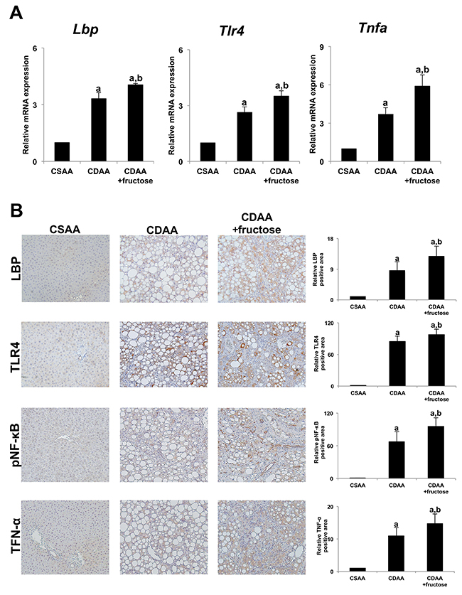 Figure 6: Fructose enhances LPS-TLR4 signaling in rat liver. (A) The expression of Lbp mRNA, Tlr4 mRNA, and Tnfa mRNA are significantly greater in both CDAA-fed groups compared with the CSAA group, and that in the CDAA + fructose group is significantly higher than in the CDAA group. (B) Immunohistochemistry of LBP, TLR4, pNF-κB and TNF-α. Original magnification x100. The hepatic expressions of each molecule are significantly higher in both CDAA-fed groups compared with the CSAA group, and that in the CDAA + fructose group is significantly higher than in the CDAA group. Data are presented as the mean ± standard deviation. aP < 0.05 compared with the CSAA group; bP < 0.05 compared with the CDAA group. CDAA, choline-deficient/L-amino acid; CSAA, choline-supplemented/L-amino acid; LBP, LPS-binding protein; LPS, lipopolysaccharide; TLR4, toll-like receptor 4; TNF-α, tumor necrosis factor alpha; pNF-κB, phospho-nuclear factor-kappa B.