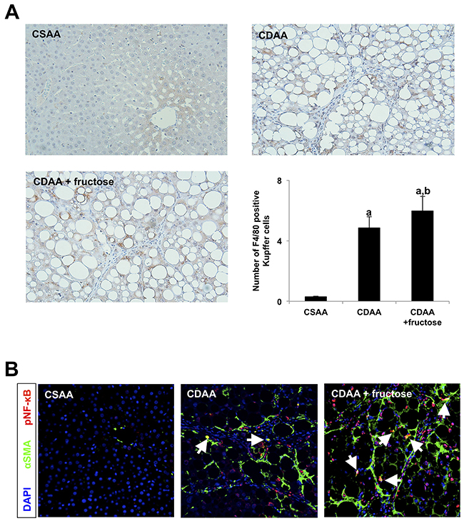 Figure 7: Leaky gut-derived hepatic LPS-TLR4-NF-κB signals interact with both Kupffer cells and Ac-HSC. (A) Immunohistochemistry of F4/80. Original magnification x100. F4/80 positive Kupffer cells are significantly increased in CDAA-fed rats when compared with the CSAA group, and oral fructose administration further increased the number of Kupffer cells in the liver. Graph shows the number of F4/80 positive Kupffer cells per field. (B) Confocal images of livers labeled by αSMA (green), nuclear (blue) and pNF-κB (red). Original magnification x100. Arrows indicate both pNF-κB and αSMA positive Ac-HSC. The number of pNF-κB positive Ac-HSC is remarkably increased when oral fructose is administrated with CDAA diet. Data are presented as the mean ± standard deviation. aP < 0.05 compared with the CSAA group; bP < 0.05 compared with the CDAA group. CDAA, choline-deficient/L-amino acid; CSAA, choline-supplemented/L-amino acid; αSMA, alpha smooth muscle actin; pNF-κB, phospho-nuclear factor-kappa B.