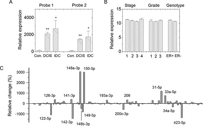 Figure 1: SDC1 and miRNA expression in GEO profile. (A) SDC1 expression profile in GDS3853 showed increased expression levels in ductal carcinoma in situ (DCIS; n = 9) and invasive ductal carcinoma (IDC; n = 5) comparing with healthy breast tissue (n = 5). Two nucleotide probes against SDC1 were used. (B) SDC1 expression in datasets GDS4056 and GDS4057 showed no significant difference in breast cancer patients at different pre-chemotherapy stages (n = 2, 40, 80, respectively), BMN grades (n = 2, 38, 74, respectively), or ER+/ER– genotypes (n = 84 and 58, respectively). (C) Comparison in relative change of miRNA expressions in normal tissues (n = 5) and malignant tissues (n = 93) using GEO data GSE7842. Data were mean ± S.E. **p < 0.01. *p < 0.05.