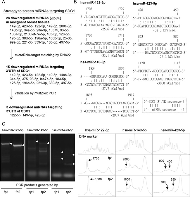 Figure 2: Potential microRNAs regulated SDC1 gene expression in breast cancer cells. (A) Strategy to screen potential miRNAs regulating SDC1 protein expression. The downregulated miRNAs in GSE7842 were listed and filtered by RNA22 tools and multiplex PCR approach. Three downregulated miRNAs (hsa-miR-122-5p, -149-5p, and -423-5p) were selected. (B) Prediction of miRNA-SDC1_3′UTR duplex by RNA22 algorithm with folding energy of heteroduplex ≥ 25 kcal/mol (C) Multiplex PCR approach was used to validate the microRNA targeting sites. Two site-specific forward primers (fp1 and fp2), which targeted at locations with defined interval, were used individually in two independent PCR reactions. The histograms were generated by ImageJ to allocate the sizes of PCR products. The PCR products generated by site-specific forward primers (fp1 or fp2), which were consistent with prediction in Figure 2B were indicated by white arrowheads in the gels and arrows in the histograms. The peaks of DNA marker corresponded to the DNA size in 100, 200, 300, 400, 500, 600, 700, 800, 900, 1000, 1500, 2000, and 3000 bp, respectively.