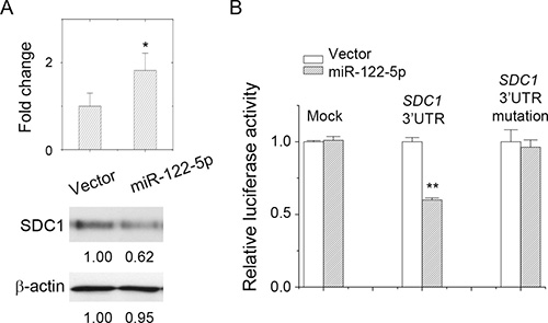 Figure 3: miR-122-5p targeted at SDC1_3′UTR and downregulated SDC1 expression. (A) Overexpression of miR-122-5p inhibited SDC1 protein expression. (B) Luciferase reporter assay showed direct targeting of miR-122-5p at SDC1_3′UTR. Mutation at miRNA-binding sites at 3′UTR abolished inhibitory effect. Data were mean ± S.E. **p < 0.01, *p < 0.05.
