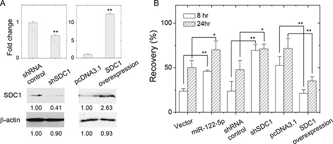 Figure 4: SDC1 expression level affected breast cancer cell mobility. (A) Change of SDC1 protein expression by transfection of shRNA against SDC1 or SDC1 overexpression. (B) Cell mobility of MCF-7 cells as assayed by wound healing assay showed increased recovery by suppression of SDC1 expression (transfection of shRNA against SDC1 or miR-122-5p), and decreased mobility by SDC1 overexpression. Data were mean ± S.E. **p < 0.01. *p < 0.05.