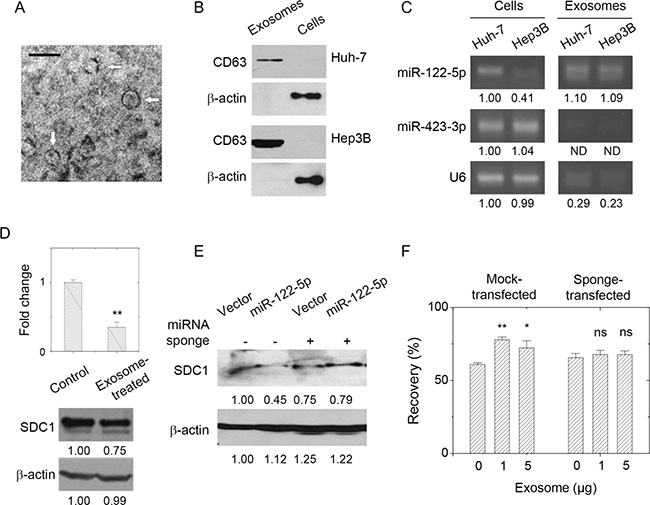 Figure 5: Presence of miR-122-5p in hepatoma-derived exosome affected breast cancer cell mobility through SDC1 down-regulation. (A) Characterization of hepatoma cell-derived exosomes by transmission microscopy. Bar = 100 nm. (B) Characterization of hepatoma cell-derived exosomes by the presence in CD63 by western blot. (C) The level of miR-122-5p in hepatoma cells and hepatoma cell-derived exosomes as analyzed by PCR. It showed the enrichment of miR-122-5p in the exosomes, but not for miR-423-3p (control) or U6 small RNA. (D) Treatment of breast cancer cells with hepatoma cell-derived exosomes (5 μg) gave decreased SDC1 mRNA and protein expression. (E) Transfection of miR-122-5p-specific sponge into MCF-7 cells rescued the suppression of SDC1 downregulation by miR-122-5p (the third and fourth lanes) comparing with those transfected with mock sponge (the first and second lanes). (F) Treatment of MCF-7 cells with hepatoma cell-derived exosomes increased cell mobility as observed by increased recovery in wound healing assay (in mock-transfected cells). The presence of miR-122-5p-specific sponge abolished the effect of exosome treatments. Data were mean ± S.E. **p < 0.01, *p < 0.05. ns: not significant.