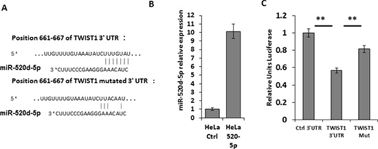 Figure 2: miR-520d-5p targets TWIST1 in its 3′ UTR. (A) Schematic representation of the predicted binding site of miR-520d-5p in the 3′UTR of TWIST1 (upper) and of the mutated site with seed deletion (TWIST1 Mut, lower). The nucleotide positions are indicated (B) qRT-PCR for the expression of miR-520d-5p in HeLa cells transduced with either a control miR (CTRL) or miR-520d-5p. (C) Control 3′UTR, WT TWIST1 3′UTR or mutated TWIST1 3′UTR (Mut) were fused to firefly luciferase, and co-transfected with renilla luciferase into HeLa cells overexpressing miR-520d-5p. The luciferase activity was measured and normalized to renilla activity. The control 3′UTR activity was set to 1. Results are representative of two independent experiments. **P < 0.015.