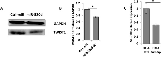 Figure 3: The miR-520d-5p downregulation of TWIST1 leads to decreased miR-10b expression. (A) Western blot for TWIST1 expression (bottom plots) in HeLa cells over expressing a control miRNA (left) or miR-520d-5p (right). GAPDH was used as loading control (top plots). Quantification of normalized data (B) *P < 0.03 results are representative of two independent experiments. (C) Levels of miR-10b quantified by qRT-PCR in cells overexpressing miR-520d-5p or control miR (normalized to U6). Results are representative of two independent experiments. *P < 0.03.