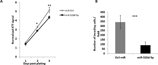 Figure 6: miR-520d-5p reduces proliferation and cellular invasiveness. (A) MDA-MB-231 cells overexpressing either a control miR (grey line) or miR-520d-5p (black line) were subjected to a XTT assay to measure proliferation rate. Significant differences were observed starting day 2 post plating. P* < 0.03, ** < 0.005 by a two tailed student’s t-test. (B) MDA-MB-231 cells overexpressing either a control miR (grey bars) or miR-520d-5p (black bars) were tested to their ability to invade through Matrigel covered 8μm pores for six hours. The membranes were washed, fixated and stained, 10 random fields were quantified P*** < 7*10−5