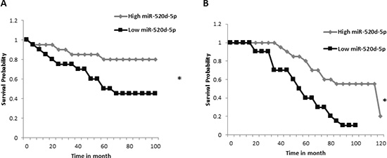 Figure 7: High expression of miR-520d-5p correlates with higher survival percentage. Graphical output of the “MIRUMIR” algorithm [27], for the search term “miR-520d-5p” (A) Data set for nasopharyngeal carcinoma with the GEO accession GSE36682. (B) The data set used for breast cancer with the GEO accession GSE22216. *P < 0.00665.