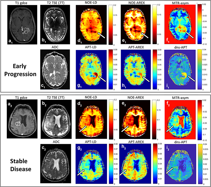 Figure 4: Exemplary CEST MR-images. Top: Early progression. Bottom: Stable disease. a1 and a2: T1-weighting with gadolinium enhancement (3 Tesla), b1 and b2: T2-weighted TSE (7 Tesla), c1 and c2: ADC-map (3 Tesla), d1 and d2: NOE-LD, e1 and e2: NOE-AREX, f1 and f2: NOE-weighted MTRasym, g1 and g2: APT-LD, h1 and h2: APT-AREX, i1 and i2: dns-APT. NOE-LD and -AREX-mediated images show a decreased tumor signal, with much lower values in the early progression case (arrows in d1–e1 compared to d2–e2). The opposite is true for the MTRasym contrasts (arrow in f1 compared to f2). APT-mediated images show a considerably higher signal intensity within the early-progressive tumor (arrows in g1–i1 compared to g2–i2).