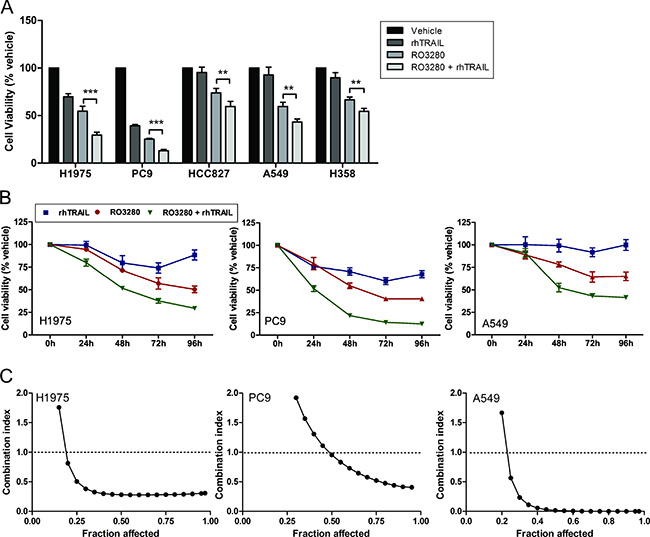 Figure 2: Synergistic effect of RO3280 and rhTRAIL combined treatment in NSCLC cells. Cells were cultured simultaneously with 50 nM RO3280 and 20 ng/ml rhTRAIL (A, B) and an increased concentration of RO3280 (nM) and rhTRAIL (ng/ml): 1) 0:0; 2) 0.05:0.02; 3) 0.5:0.2; 4) 5:2; 5) 50:20; 6) 500:200; 7) 5000:2000 (C). Cell viability was analyzed by MTS assays after 72 hrs incubation (A) or at indicated time points (n = 4, mean ± SD) (B). The combination index/fraction affected curve was calculated with the Compusyn program (C).