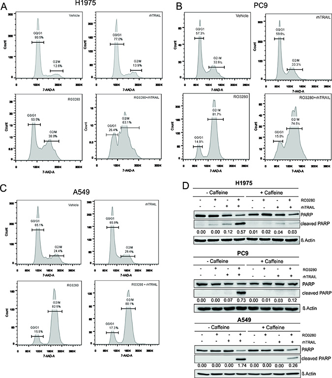 Figure 4: RO3280-induced G2/M cell cycle arrest sensitizes NSCLC cells to TRAIL-induced apoptosis. H1975, PC9 and A549 cells were treated with 50 nM RO3280 and 20 ng/ml rhTRAIL for 24 hrs. Cells were stained with 7-AAD and the cell cycle was analyzed by flow cytometry (A–C). Cells were treated with or without caffeine (300 μg/ml for H1975 and A549, 600 μg/ml for PC9 in serum free medium) for 12–18 hrs, followed by RO3280 and rhTRAIL treatment for 24 hrs. Cell lysates were analyzed by western blot with indicated antibodies. PARP cleavage normalized by β-Actin were quantified by Image studio (D).