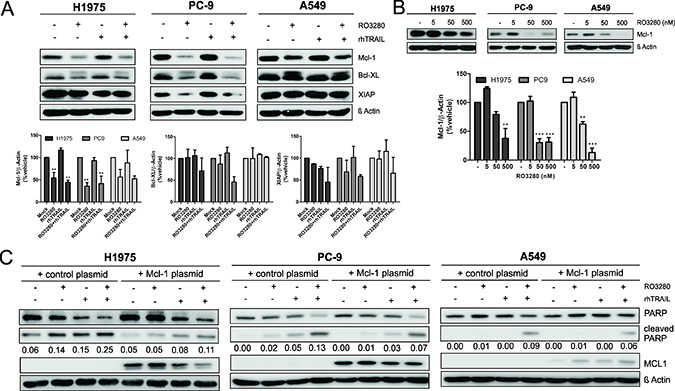 Figure 5: Mcl-1 downregulation by RO3280 increase TRAIL apoptotic activity in NSCLC cells. Cells were cultured with 50 nM RO3280 and 20 ng/ml rhTRAIL (A) or 5, 50, 500 nM RO3280 for 24 h (B) The cell lysates were analyzed by western blot with indicated antibodies and immunoblot bands values are shown in histograms (n = 3, ± SEM) (A, B). Cells were transfected with an Mcl-1 encoding plasmid or a control plasmid 24 hrs prior to treatment (C). The cells were further treated with RO3280 (50 nM) and rhTRAIL (20 ng/ml). After 24 hrs, cell lysates were analyzed by western blot. PARP cleavage normalized by β-Actin (C).