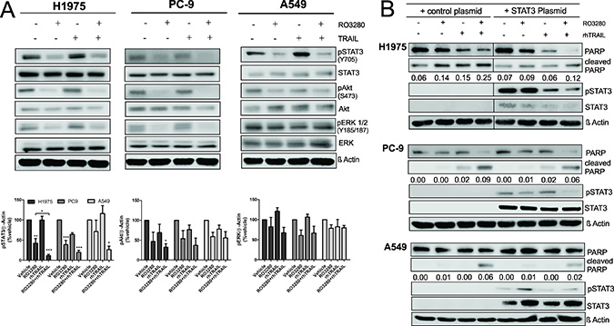 Figure 6: The influence of RO3280/rhTRAIL combined treatment on the signaling pathway in NSCLC cells. H1975, PC9, and A549 cells were treated with a combination of RO3280 (50 nM) and rhTRAIL (20 ng/ml) for 24 hrs and cell lysates were analyzed by western blot with indicated antibodies (A). Quantification of immunoblot analysis blots are shown in histogram (n = 3, ± SEM) (A). Cells were transfected with STAT3 plasmid or a control plasmid 24 hrs prior to drugs treatment and were further treated with RO3280 (50 nM) and rhTRAIL (20 ng/ml) (B). After 24 hrs, cell lysates were analyzed by western blot with indicated antibodies (B). PARP cleavage normalized by β-Actin were quantified by Image studio. Cell lysates for each cell line were run in the same gels (B).