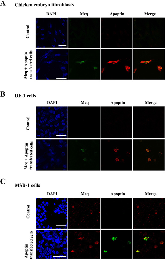 Figure 1: Localisation of Meq and Apoptin. Immunofluorescence was carried out on (A) CEF and (B) DF-1 cells transfected with expression constructs containing wild type Meq and N-terminally FLAG tagged Apoptin. Cells were fixed after 24–48 hours and stained with polyclonal Meq (green fluorescence) or monoclonal FLAG (red fluorescence) antibodies. In both cases CEF and DF-1 cells showed localisation of both Apoptin and Meq in the nucleus of the transfected cells. (C) MSB-1 cells were transfected with FLAG-Apoptin, fixed and then stained for endogenous levels of Meq (red fluorescence) or FLAG tagged Apoptin (green fluorescence). In MSB-1 cells Apoptin was also localised in the nucleus along with Meq. Upper panel figures of (A), (B) and (C) were from CEF, DF-1 and MSB-1 isotype controls/cells, respectively. Confocal photomicrographs are representative of three independent experiments on CEF, DF-1 and MSB-1 cells. Scale bar represents 40 μm.