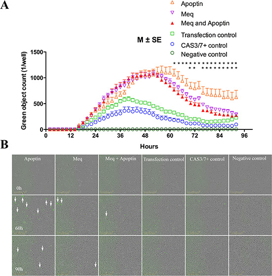 Figure 4: Meq, Apoptin, Meq-Apoptin plasmid transfected DF-1 cells were monitored in real time by the live cells imaging system IncuCyte. (A) Meq-Apoptin co-transfected cells apoptosis was significantly lower than Apoptin transfected cells between 60 and 92 h. And Meq-transfected cells apoptosis was significantly lower compared to Apoptin-transfected cells between 68 and 92 h, except at 74 h. Growth curves are shown as means of six independent experiments ± standard error (SE). An asterisk (*) indicates statistically significant difference (P < 0.05) between Apoptin and Meq-Apoptin or Meq transfected cells. (B) Representative IncuCyte live cells images illustrating evolution of apoptotic cells (green) at 0, 60 and 90 h. Transfection control, Caspase 3/7 positive control and negative control cells were used as controls.
