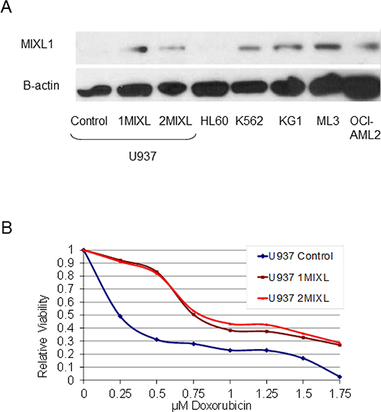 Figure 1: MIXL1 expression confers decreased sensitivity to doxorubicin in AML cells. (A) Stable transfectants of U937 cells express MIXL1 at levels similar to those of endogenous MIXL1 in AML cell lines. MIXL1 was detected by probing 30 μg of whole cell lysates resolved on SDS-PAGE and transferred to PVDF membrane, with rabbit antibodies against N-terminal epitope of MIXL1 and with β-actin for a loading control [17]. (B) MIXL1 expression reduces sensitivity of U937 cells to doxorubicin. The cell lines were treated with 0–1.75 μM doxorubicin on day 0. Cell survival was measured at 24 hours by MTS assay as detailed in Materials and Methods. Absorbance of untreated cells was normalized to 1. Relative viability at varying concentrations of doxorubicin is denoted.
