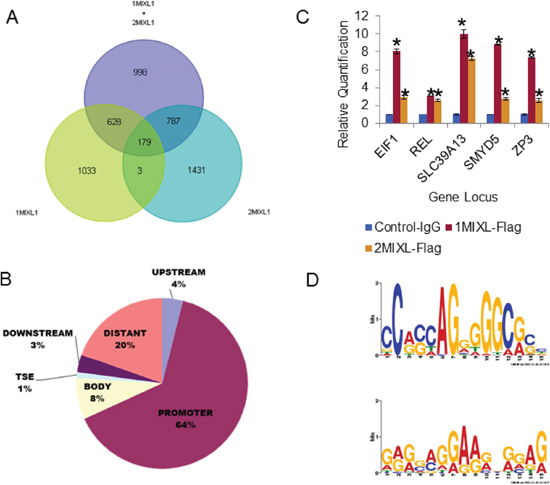 Figure 2: Identification of direct MIXL1 transcriptional targets by ChIP-Sequencing. (A) Venn diagram 1MIXL-Flag normalized to control-Flag and control-IgG (Set 1), 2MIXL-Flag normalized to control-Flag and control-IgG (Set 2), and 1MIXL-Flag and 2MIXL-Flag combined and normalized to control-Flag and control-IgG (Set 3). A total of 179 peaks shared by the three groups is denoted. (B) Pie chart depicting localization of MIXL1 in the human genome. Peaks were classified according to distance from the nearest transcribed gene using the following criteria: upstream was 5–25 kbp 5′ of the transcription start site, promoter was 0–5 kbp upstream of the transcription start site, body was between the transcription start site and end, TSE was 0–5 kbp downstream of the transcriptional end, downstream was 5–25 kbp downstream of the transcriptional end, and distant peaks were those not allocated to a gene. Note that the majority of peaks (64%) localized to gene promoters. (C) ChIP of five candidate peaks identified by ChIP-Se1. FLAG antibodies were used and ChIP-Seq (EIF1, c-REL, SLC39A13, SMYD5, and ZP3) showed specific MIXL1 binding to both 1MIXL and 2MIXL clones by ChIP normal mouse IgG served as control. Error bars represent standard deviation between triplicates. (D) The most common motif in the ChIP-seq peaks are Zinc-Finger binding sites. Motif1 and Motif2 were the two most statistically significant generated using the Multiple EM for Motif Elicitation [MEME] against the peak regions identified in the ChIP-seq analysis. Both motifs are C/G-heavy regions with similarity to known zinc finger motifs.