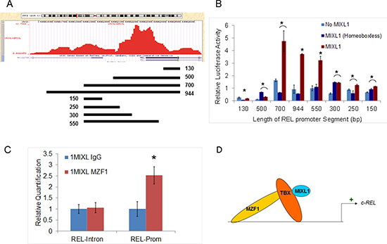 Figure 4: MIXL1 binds to the c-REL promoter. (A) c-REL promoter peak region identified by ChIP-Seq, as generated by the University of California, Santa Cruz, genome browser is shown. The location and size of each promoter fragment used for the luciferase reporter assay is displayed underneath. (B) MIXL1 binds to a 550-bp region within the c-REL promoter. Regions of the DNA depicted in 4A were cloned into the reporter vector pBV-Luc luciferase, which were then transiently co-transfected into HEK293T cells with MIXL1, MIXL1 Homeobox-less, or empty expression vector. Equal amount of Renilla luciferase co-transfected with the reporter constructs allowed normalization. Luciferase activity of each combination was tested in triplicate after 48 hours. Error bars represent standard deviation between triplicates. (C) MZF1 binds to the same locus as MIXL1 on c-REL promoter. Quantitative PCR analysis of the identified c-REL promoter region and c-REL intron control region compared the abundance of each genomic locus immunoprecipitated by either IgG or MZF1 antibodies, normalized to a standard curve. Error bars represent standard deviation between triplicates. *p < 0.05. (D) Model depicting a potential MIXL1-TBX-MZF1 multiprotein complex activating c-REL transcription.
