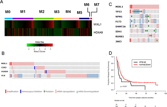 Figure 5: High MIXL1 expression denotes a distinct subset of AML. (A) Mutually exclusive expression of MIXL1 and HOXA9 in distinct FAB subsets. The RNA-seq data are publicly available from the TCGA website (https://tcga-data.nci.nih.gov/tcga/). 177 samples of Acute Myeloid Leukemia classified by leukemia French American British morphology code (FAB) and a total of 20319 genes with expression values in the RPKM format were included. The data were quantile normalized using the normalize Quantiles function from the limma package. The expression levels of MIXL1 and HOXA9 of the 177 samples from 8 FAB categories were plotted in the heatmap using the heatmap.2 function in the gplots package of R 3.1.1. Within each FAB category, the samples were ordered according to the expression value of the MIXL1 gene. (B) MIXL1 upregulation identifies a non-overlapping AML subset from those expressing CDX2, HOXA9, or HLX. TCGA AML patient dataset was queried for alterations in expression as determined by RNA-Seq across 166 AML cases through the cBioPortal database. Each column represents a case of AML. MIXL1 is amplified or upregulated in 13% of the total AML cases. Note the predominantly non-overlapping expression patterns of MIXL1, CDX2, HOXA9, and HLX. (C) Seventy-six percent (16/21) of MIXL1-expressing cases in TCGA AML dataset harbored somatic mutations common in AML (NPM1, FLT3, DNMT3A, IDH1, RUNX1 JAK3, and TP53). Each column represents a case. (D) Relapse-free survival of MIXL1-expressing cases is lower than that of non–MIXL1-expressing cases. TCGA AML cases were separated into two groups: MIXL1-expressing (increase in expression or amplified) and non–MIXL1-expressing. Relapse-free survival was then compared between the two groups using the Kaplan-Meier method.