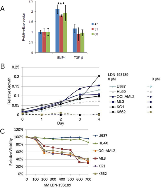 Figure 6: BMP4 induced MIXL1, an important survival axis and therapeutic target in AML. (A) MIXL1 expression increased 2-fold in CD34+ HSPCs treated with BMP4. CD34+ HSPCs from three cord blood donors (unique donor number 47, 51, 60) were cultured with either 50 ng/ml BMP4 or 2 ng/ml TGF-β1 for 2 hours. MIXL1 transcript levels were quantified by RT-qPCR using 18S rRNA as normalization control. Error bars represent standard deviation between triplicates. *p < 0.05. (B) LDN-193189 at 3 μM was cytotoxic to OCI-AML2, ML3, KG1, and K562 cells but not U937 and HL60 cells. Each cell line was treated with vehicle or 3 μM LDN-193189 on day 0, and viability was measured every 24 hours by MTS assay in triplicate. (C) OCI-AML2, ML3, KG1, and K562 were sensitive to 200 nM LDN-193189, while the non–MIXL1-expressing lines U937 and HL60 were unaffected. Each cell line was treated in triplicate with 0–700 nM LDN-193189, with the drug or control medium replenished every 24 hours, for 4 days. Viability on day 4 was assayed by MTS assay. Absorbance was normalized to that of control samples treated with vehicle only.