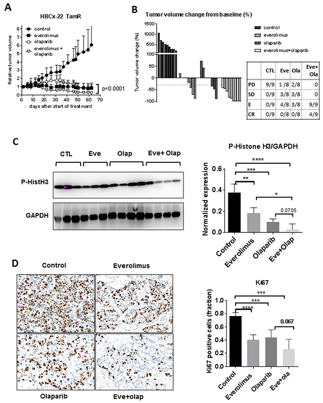 Figure 1: Anti-tumour activity of everolimus and olaparib in a BRCA2-mutated ER+ breast cancer. (A) tumour growth curves of the HBCx-22 TamR xenograft treated by olaparib, everolimus and the combination. (B) waterfall plot displayed as percent of tumour volume change from baseline (each bar is an individual xenograft). (C) Western blot analysis of Histone H3 phosphorylation in HBCx22 TamR. (D) IHC analysis of Ki67 in the HBCx-22 TamR xenografts. Quantitative analysis of Ki67-positive cells was performed on technical replicates (N=5) and counting >100 nuclei. Statistical analysis of normalized P-histone H3/GAPDH and Ki67 staining between groups was performed by the unpaired t-test.*p<0.05; **p<0.005; ***p< 0.0005.