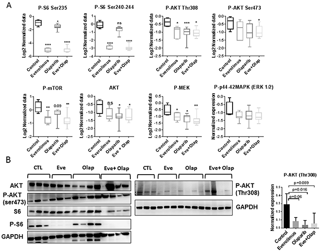 RPPA analysis of proteins involved in PI3K and MAPK pathways showed strong inhibition of P-S6 in the everolimus treated xenografts (monotherapy and combination groups) and inhibition of AKT phosphorylation (Thr308) by everolimus and olaparib (Figure 4A). Phospho-MEK was also significantly decreased in all groups as compared to control. Western blot analysis of P-S6 and P-AKT confirmed RPPA results (Figure 4B).