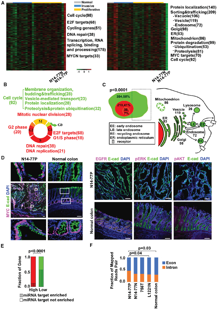 Figure 4: Highly- and lowly expressed genes in N14-77 polyps differ in function, cell cycle phase, cellular location and miRNA target site enrichment. (A) Heatmaps from left to right indicate the log2 (FPKM) values of 474 highly- and 614 lowly expressed genes in 28 canine intestinal samples grouped as shown. Significantly enriched functions are listed next to the heatmap, with the total number of genes involved shown in the parenthesis. (B) Red and green respectively designate highly and lowly expressed genes, along with their enriched functions and cell cycle phases. Yellow indicates cell cycle phases enriched in both highly and lowly expressed genes. (C) Highly expressed genes are enriched in the nucleus (red) and lowly expressed genes are enriched in the cytoplasm (green), e.g., “354, 58%” indicating 354 genes, which make up 58% of all lowly expressed genes, located in the cytoplasm. The small red circle inside the nucleus designates the nucleolus. The right image illustrates that the sub cellular locations of lowly expressed genes, e.g., 83 genes are associated with ER. (D) Representative IHC images illustrate the enrichment of nuclear protein MYC, and the depletion of membrane and cytoplasmic proteins EGFR, pERK and pAKT, in N14-77 polyps. Scale bar, 100 μm. (E) Highly and lowly expressed genes differ in enriched miRNA target sites. (F) More RNA-seq reads were mapped to intronic regions in N14-77 polyps. 756T is a canine jejunum tumor and others are described in Figure 2E.