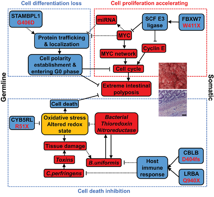 In summary, we propose that three pathways lead to N14-77 extreme intestinal polyposis (Figure 7). First, MYC and cell cycle-promoting network activation, caused by a FBXW7 somatic mutation-initiated SCF E3 ubiquitin ligase defect, keeps crypt cells dividing. Second, defective intracellular trafficking and localization, originating from D406G germline mutation of STAMBPL1 and enhanced by MYC network activation, inhibit cell polarity establishment and cell differentiation, preventing cell cycle exit. Lastly, bacterial redox systems reduce the oxidative stress caused by germline mutation R51X of CYB5RL, decreasing cell death. Lastly, we emphasize that future functional studies are required to validate our model.