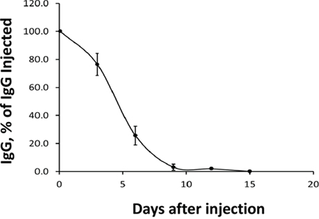 Figure 2: Disappearance of IgG 3A2 from mouse serum. 20 μgof IgG 3A2 was injected into the tail vein and samples of plasma were taken at the times indicated for measurement of human IgG by ELISA. The determined half-life of IgG 3A2 was 4.8 days. (n=4) Data are presented as the mean ± S.E.M.