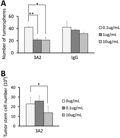 Figure 6: Effect of IgG 3A2 on tumorsphere formation and cancer stem cell proliferation. (A) The effect of IgG 3A2 treatment on stem cells tested their sphere forming ability, and (B) proliferation which was verified by direct cell counting. n=3 in both (A) and (B). For proliferation, the number of cells from each repeat was derived from an average of 3 wells. Data are presented as the mean ± S.D.; *P < 0.05 and **P < 0.01.