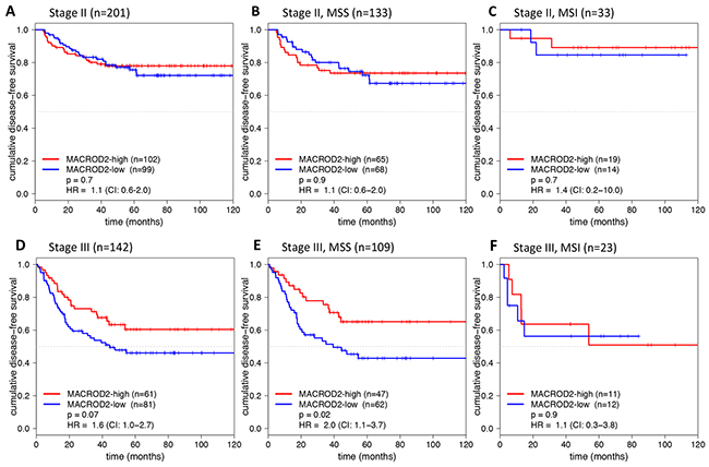 Figure 2: Kaplan-Meier plots for DFS (in months) stratified for MACROD2-high and MACROD2-low protein expression in stage II (A-C) and stage III (D-F) colon cancer patients including the subset of MSS (B, E) and MSI (C, F) patients. Log-rank p-values and Cox regression hazard ratios (HRs) with 95% confidence intervals (CIs) are reported.
