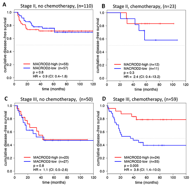 Figure 3: DFS curves (in months) for MACROD2 expression in MSS colon cancer patients who did not receive (A, C) and did receive (B, D) 5-FU-based adjuvant chemotherapy for stage II (A, B) and stage III (C, D) colon cancer patients. Log-rank p-values and Cox regression HRs (95% CI) are reported.