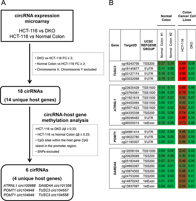 Figure 1: Screening for CpG island hypermethylation-associated silencing of circular RNAs in cancer cells. (A) Flow-chart used to identify candidate circRNAs silenced in colon cancer through CpG island hypermethylation in the promoter region of their host genes. FC, Fold Change; SNP, Single Nucleotide Polymorphism. (B) DNA methylation profile of the 5′-end CpG island regulatory region for the TUSC3, ATRNL1, POMT1 or SAMD4A genes analyzed by the 450K DNA methylation microarray. DNA methylation data for healthy colon mucosa correspond to two normal colon patient samples available at TCGA (Normal colon 1: TCGA-A6-2675-11A, sigmoid colon normal tissue; Normal colon 2: TCGA-A6-2685-11A, sigmoid colon normal tissue). Single CpG absolute methylation levels (0–1) are shown. Green, unmethylated; red, methylated. Data from normal colon, HCT-116 and DKO cells are shown.